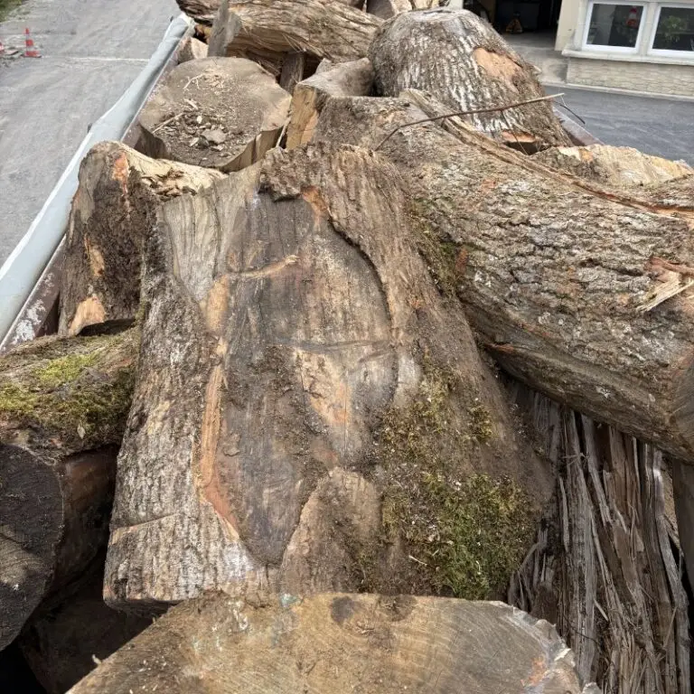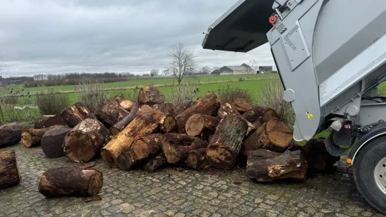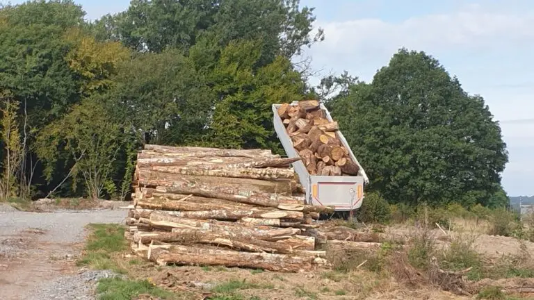 Notre parc de quatre hectares nous permet de stocker une grande quantité de grumes. Le bois est fendu lorsqu’il a environ 2 ans de coupe. Ensuite, nous le stockons en caisses. Ce sont des conditions idéales pour sécher le bois. Ainsi, nous avons du stock toute l’année en bois sec, et en bois mi-sec.